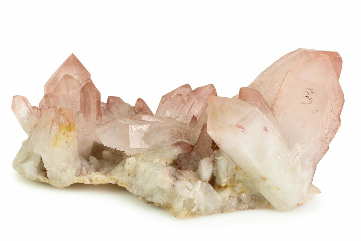 This is a gorgeous, 3.85" wide quartz crystal cluster featuring red hematite spots. The hematite causes the quartz crystals to take on a lovely pink hue. It was collected near Bharatpur, in the state of Rajasthan, India.
