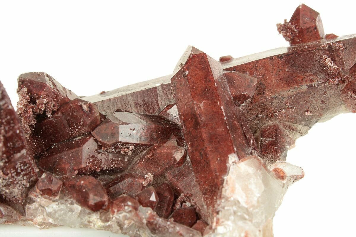 This is a top-quality cluster of natural red quartz crystals from Tinejdad, Morocco. The red coloration is due to iron oxidation across the exterior of the crystals, as well as inclusions through the crystals.