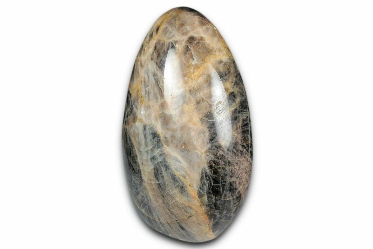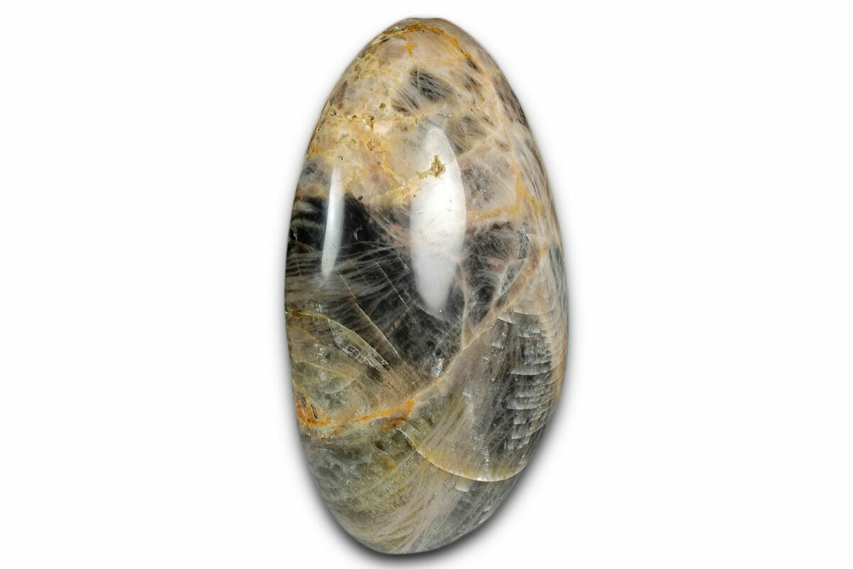 This is a 3.9" tall piece of polished black moonstone, mined and crafted in Madagascar. The base of the specimen has been cut flat for aesthetic presentation.