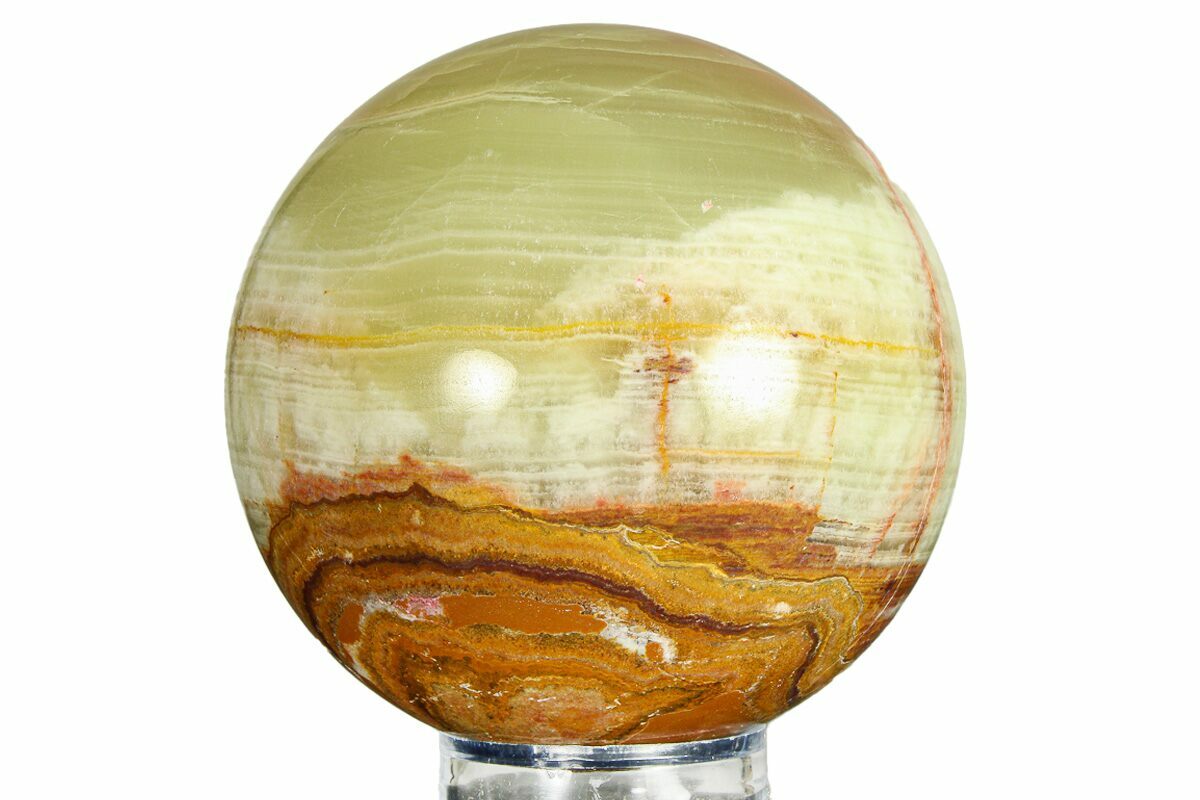 This is a beautiful polished sphere carved from a kind of calcite often (incorrectly) marketed as Pakistan green onyx. The stone shows lovely olive greens with white, brown, and pink banding. It measures 3.9" in diameter and comes with an acrylic display stand.