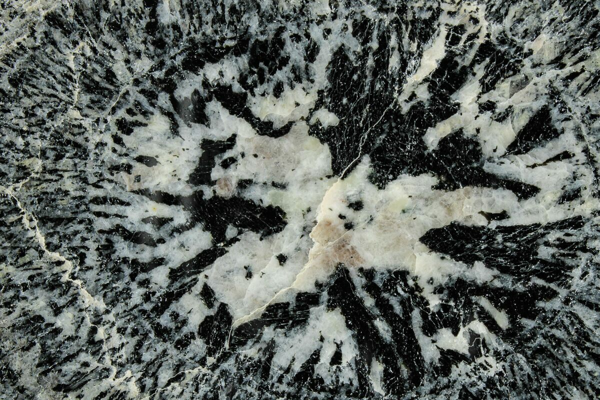 Orbicular granite occurs only rarely, and their occurrences are often very small. Most deposits are found in Finland, but notable deposits can also be found in Chile and Australia. This material is from the Australian Boogardie Orbicular Granite deposit, near Mount Magnet in Western Australia. It is characterized by light andesine with darker hornblende and biotite radiating from plagioclase or hornblende cores. This orbicular granite is touted as the oldest in the world, at almost 2.7 billion years!