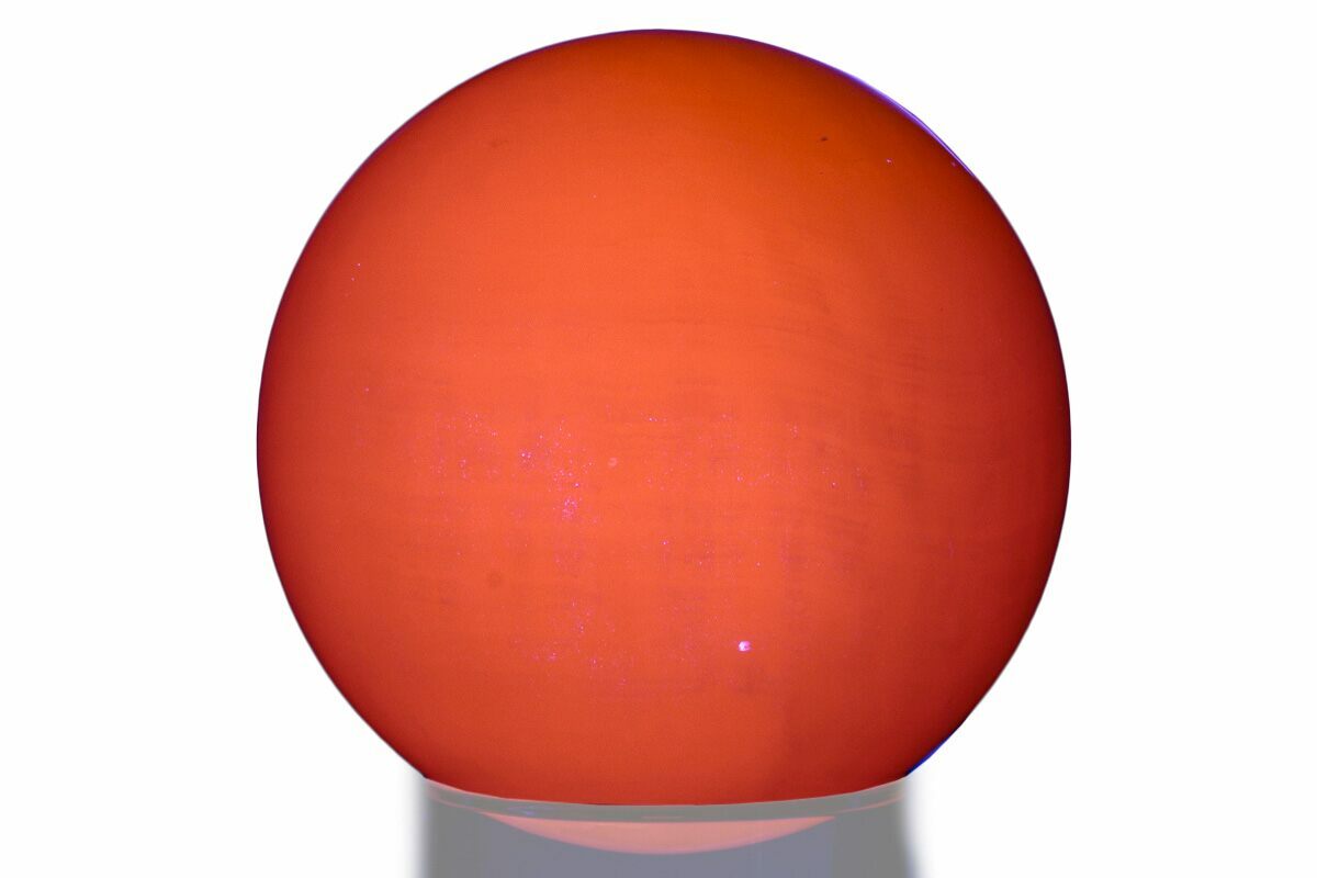 This is a gorgeous pink, 3.9" wide polished manganoan (mangano) calcite sphere. It has been expertly polished to a glossy finish all the way around, highlighting the natural banding of the mineral. This calcite exhibits an intense orange fluorescence under shortwave UV light.