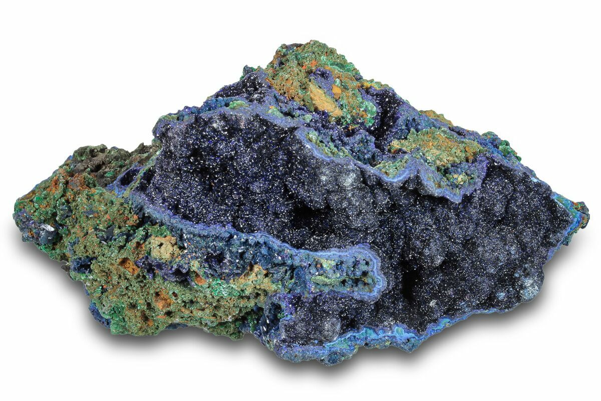 This is a beautiful, 3.9" wide association of sparkling azurite crystals with fibrous malachite, collected from the Liufengshan Mine in China.