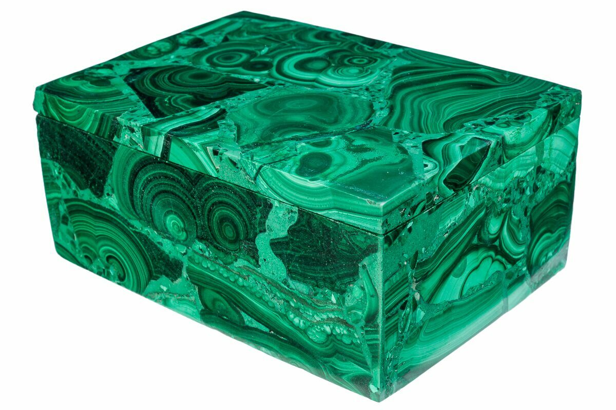 This is an absolutely gorgeous jewelry box with a removable lid, made from composited slabs of polished, silky malachite from the Democratic Republic of the Congo, Africa. The dimensions of this jewelry box are 33.9 x 2.9 x 1.7".
