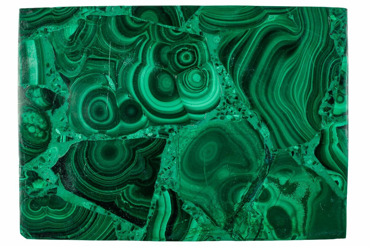 Malachite is an intense green copper-based mineral that can be found in a wide variety of forms. Malachite can grow in botryoidal masses, stalactitic formations, and reniform formations, typically as a tight cluster of fanning fibrous needles that make up a seemingly solid mass. As layers continue to stack during formation, banded patterns can sometimes begin to take shape, explaining the rings in all shades of green seen on most polished malachite specimens.