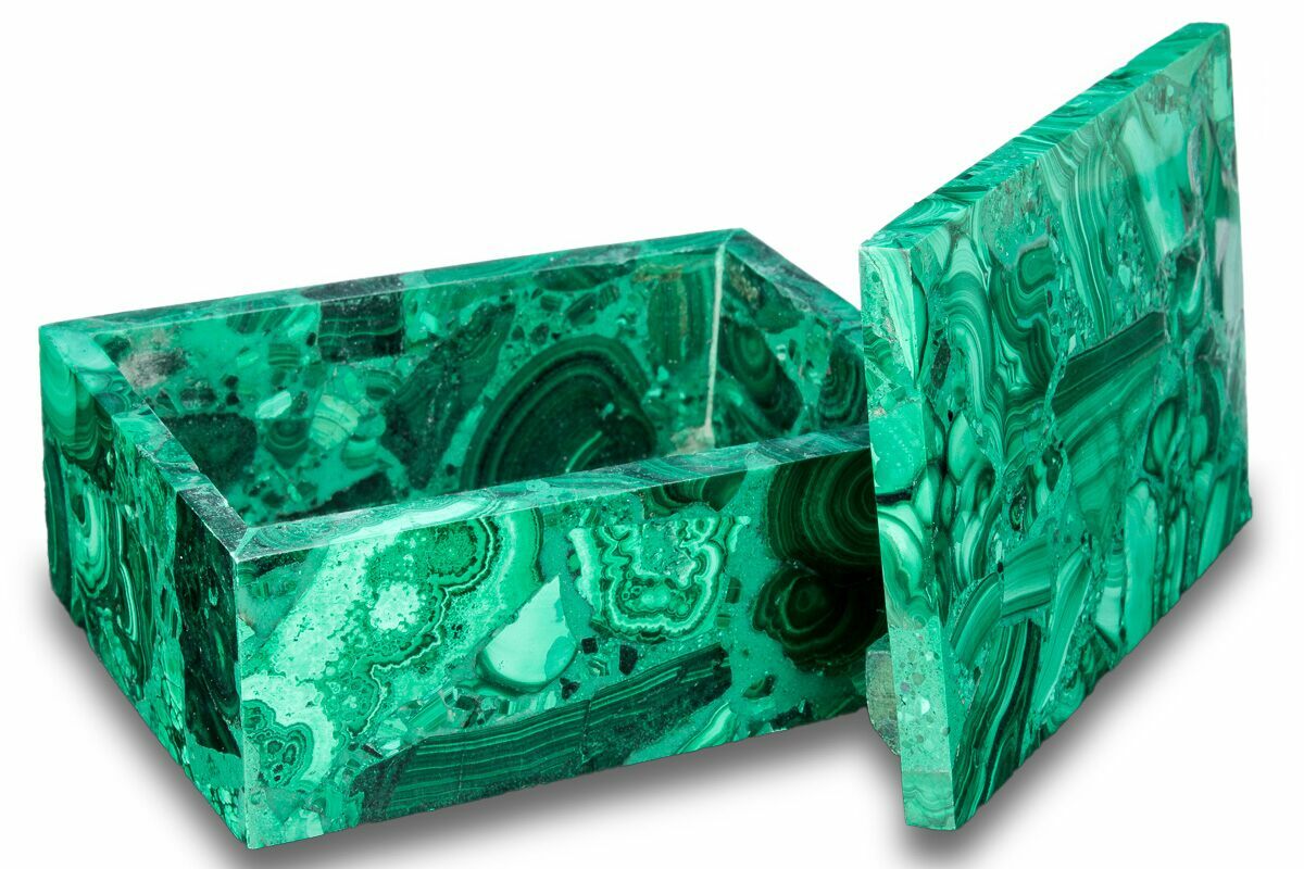 This is an absolutely gorgeous jewelry box with a removable lid, made from composited slabs of polished, silky malachite from the Democratic Republic of the Congo, Africa. The dimensions of this jewelry box are 33.9 x 2.9 x 1.7".