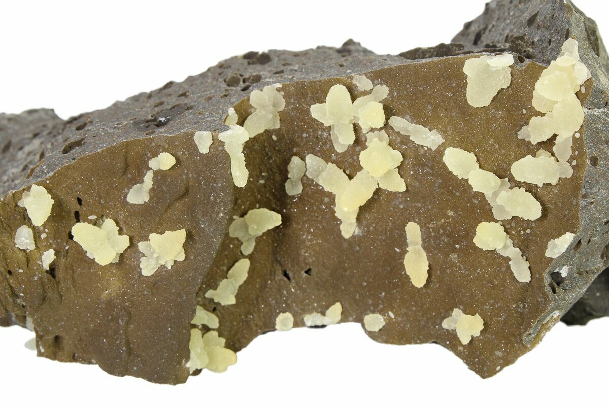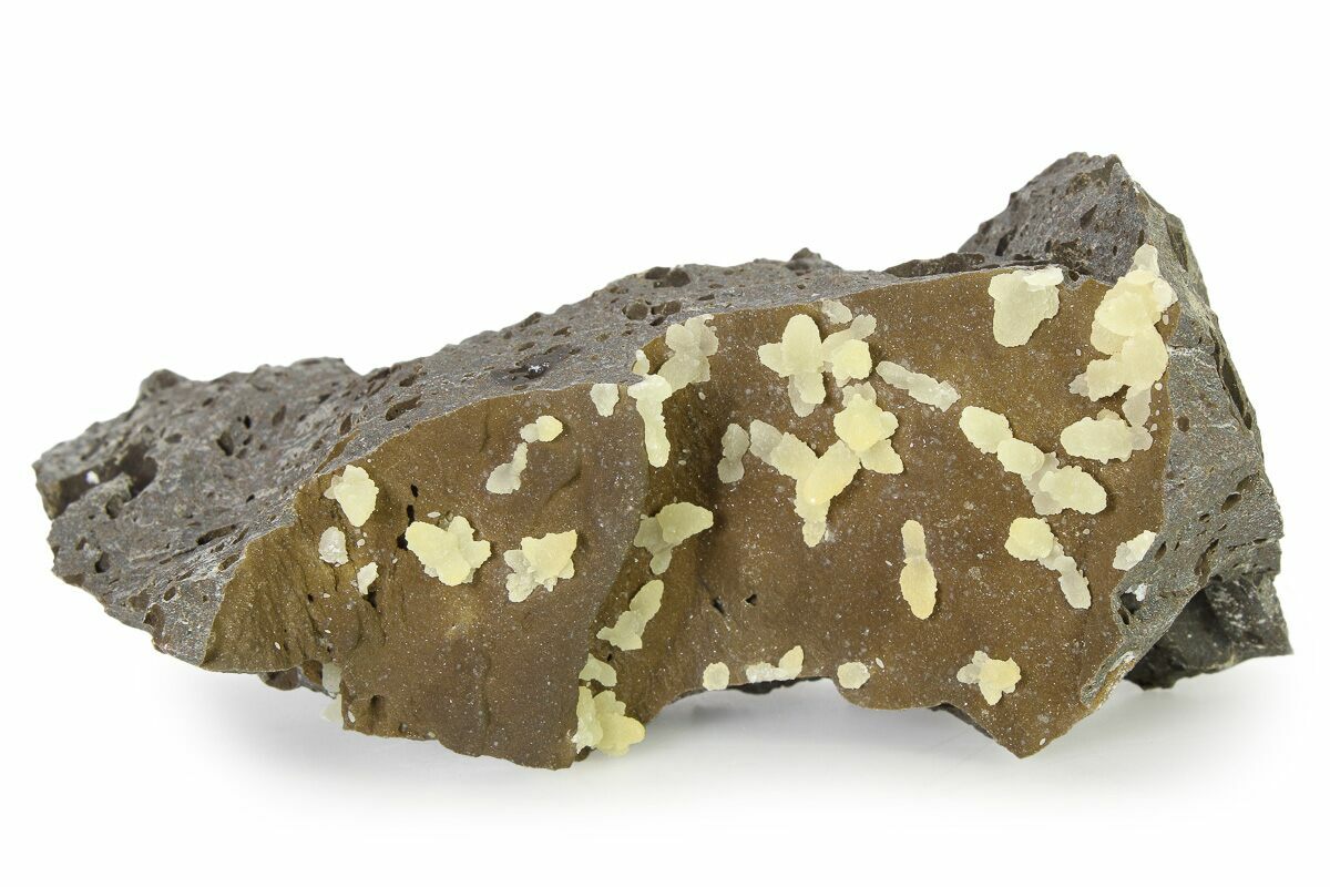 This 3.9" wide piece of tephritic lava ("basalt") features formations of yellow calcite. It comes out of the Campomorto Quarry located in the Viterbo Province of Italy.