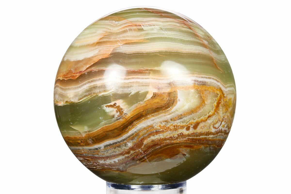 This is a beautiful polished sphere carved from a kind of calcite often (incorrectly) marketed as Pakistan green onyx. The stone varies from pale to deep olive green and has white and red banding throughout. It measures 4.0" in diameter and comes with an acrylic display stand.