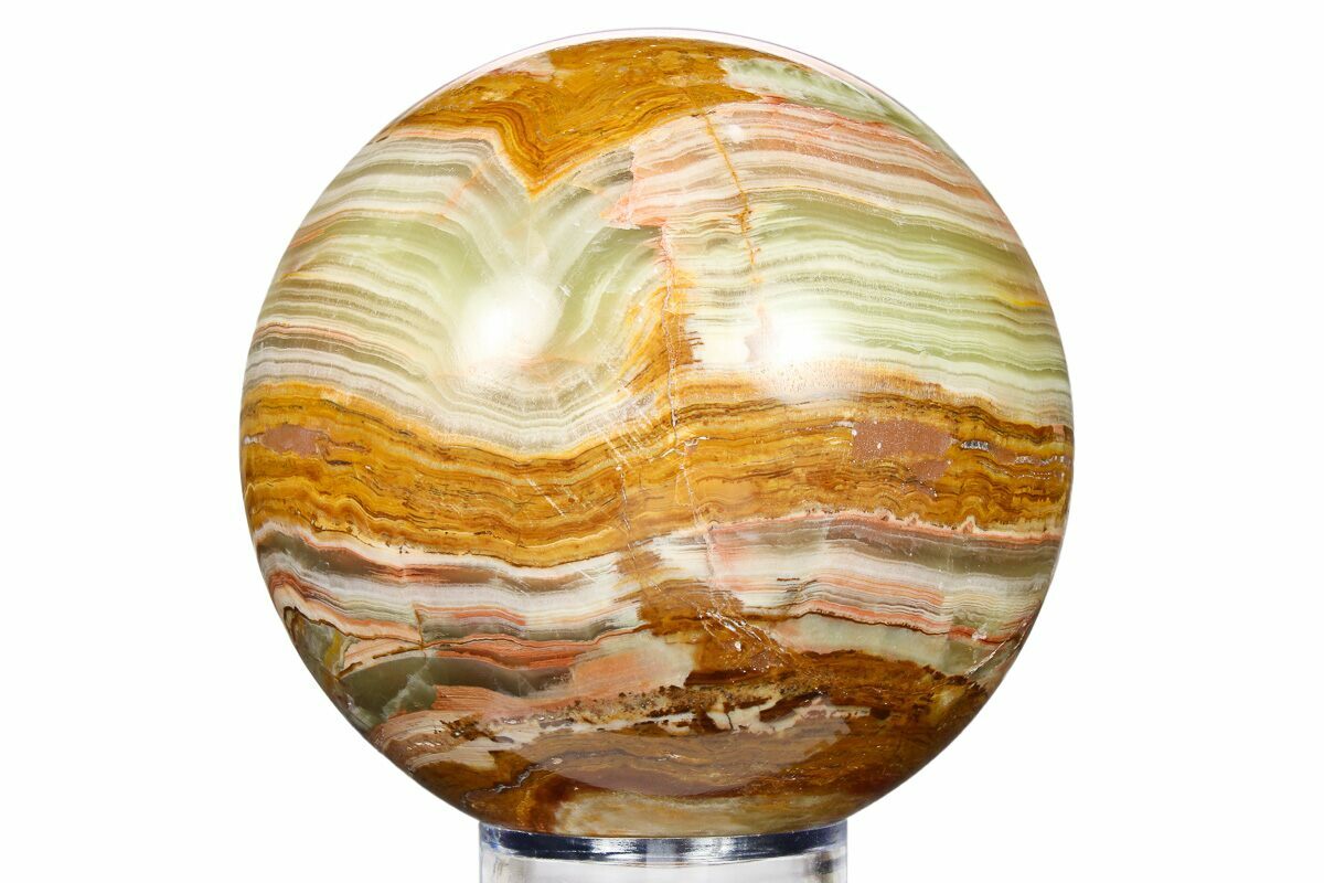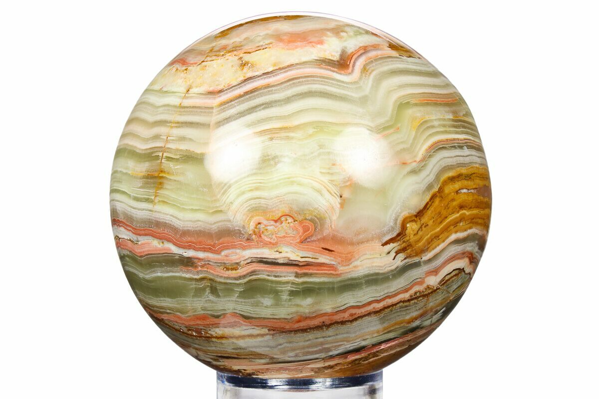 This is a beautiful polished sphere carved from a kind of calcite often (incorrectly) marketed as Pakistan green onyx. The stone has deep olive green pockets between white, brown, and red banding. It measures 4" in diameter and comes with an acrylic display stand.