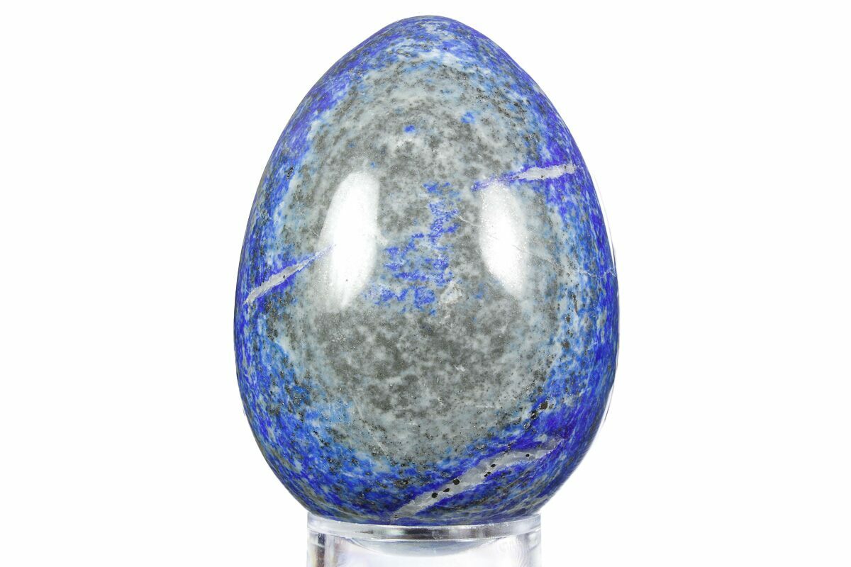 This is a 3.95" tall, polished lapis lazuli egg with streaks of sparkling pyrite running through it. The vibrant blue stone was mined from Northern Pakistan. It comes with the pictured display stand.