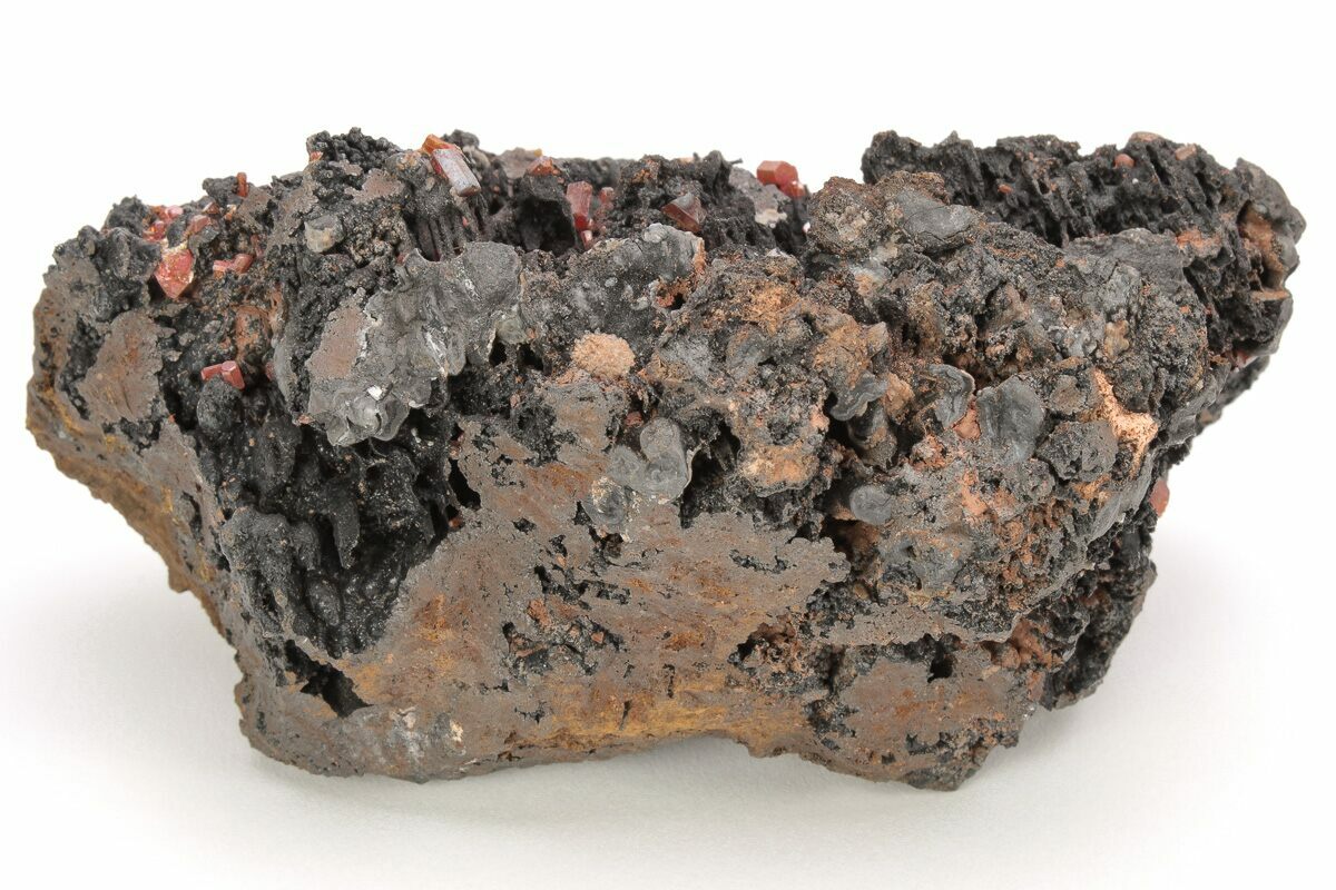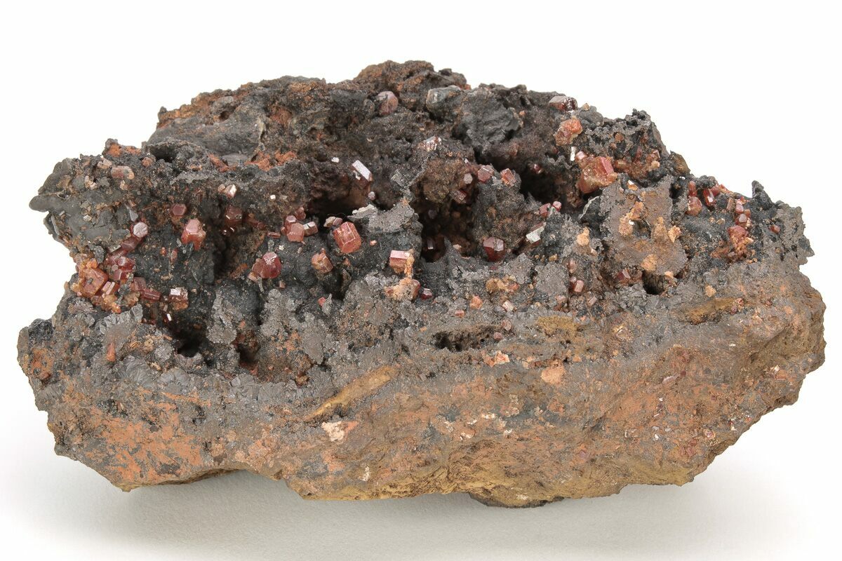 This specimen contains lustrous red Vanadinite crystals, naturally displayed on an iron-manganese oxide matrix. Both iron rich, and manganese rich matrix' can be seen on opposite sides of this specimen.