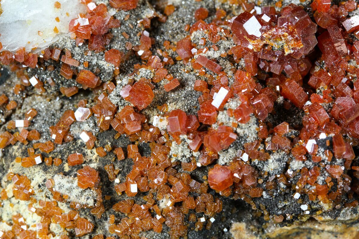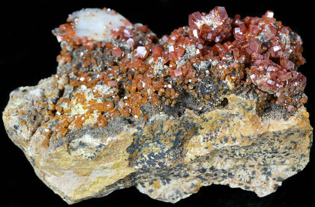 Vanadinite from Morocco is world-famous for producing some of the finest red crystal specimens on the planet. In the arid hills surrounding Mibladen and Taouz, vanadinite forms as vibrant clusters of hexagonal prisms, often with a deep crimson to orange-red color that seems to glow against the pale desert matrix. These crystals typically develop in dense groups, coating barite blades or covering weathered limestone with dazzling, glassy faces and sharp geometric symmetry. The dryness of the region and the slow oxidation of ancient lead deposits create the perfect geochemical environment for vanadinite to grow with exceptional clarity, luster, and intensity of color. Moroccan vanadinite is highly prized by collectors for its bold aesthetics, architectural crystal formations, and the consistent quality that has made these localities the global benchmark for the species.