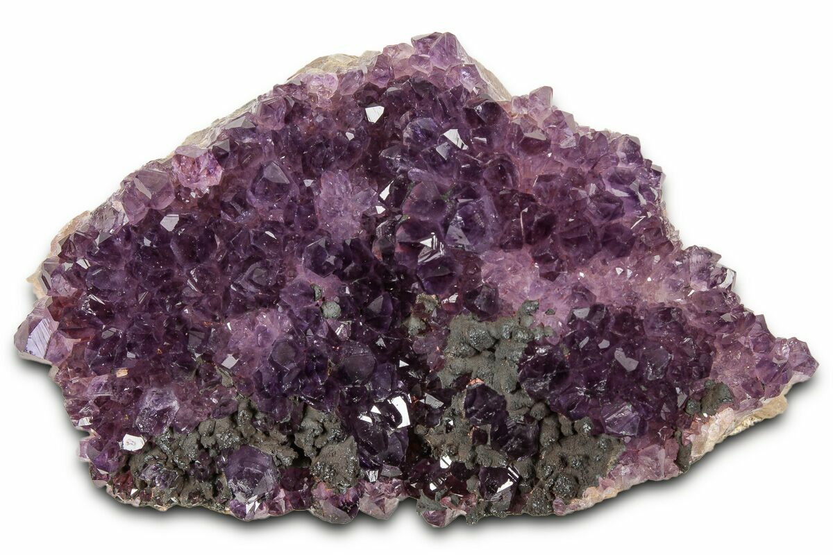 This is a beautiful purple cluster of amethyst crystals collected from Turkey. It contains many dark grape juice colored crystals with remarkable luster. There is a cluster of dark hematite crystals along one edge of this specimen.