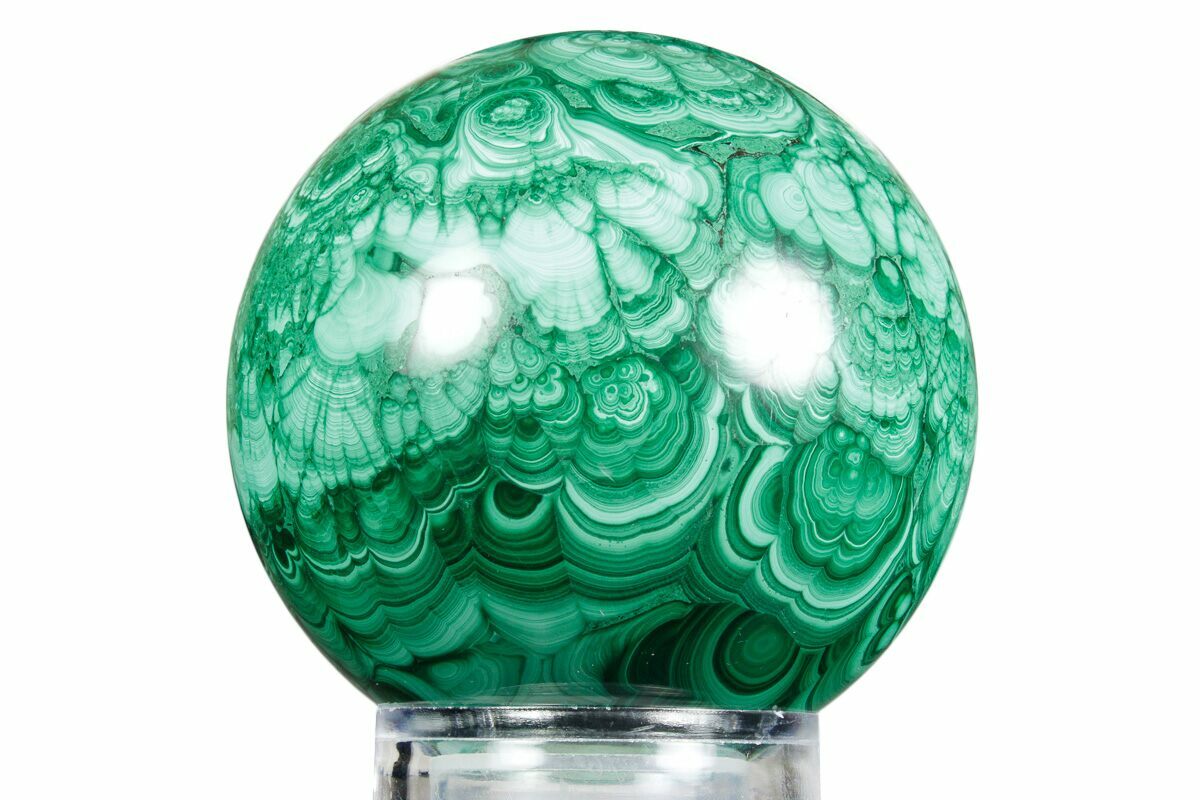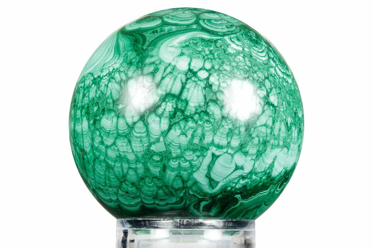 This 3" natural malachite sphere is cut from a solid piece of stone. It displays saturated green coloration with concentric banding and floral patterning typical of malachite growth. Swirling flow structures create rosette-like motifs with strong contrast and depth. The sphere is smoothly polished, clearly revealing the mineral’s natural structure and patterning.