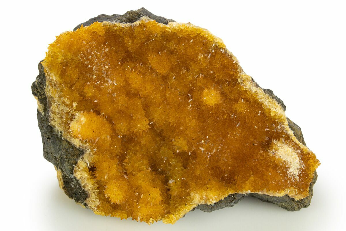 Orange calcite specimens from the Grabiszyce Basalt Quarry near Leśna are classic examples of basalt-hosted calcite crystallization, featuring warm apricot-to-deep orange crystals set dramatically against dark, fine-grained volcanic rock. The calcite typically occurs as sharp scalenohedral (“dogtooth”) crystals or sparkling drusy coatings lining small cavities and fractures within the basalt. Color intensity ranges from pale honey to saturated tangerine and is commonly attributed to trace iron incorporated during crystal growth, sometimes producing subtle zoning. The visual contrast between vivid calcite and nearly black basalt matrix gives these specimens a bold, unmistakably volcanic character that displays exceptionally well.