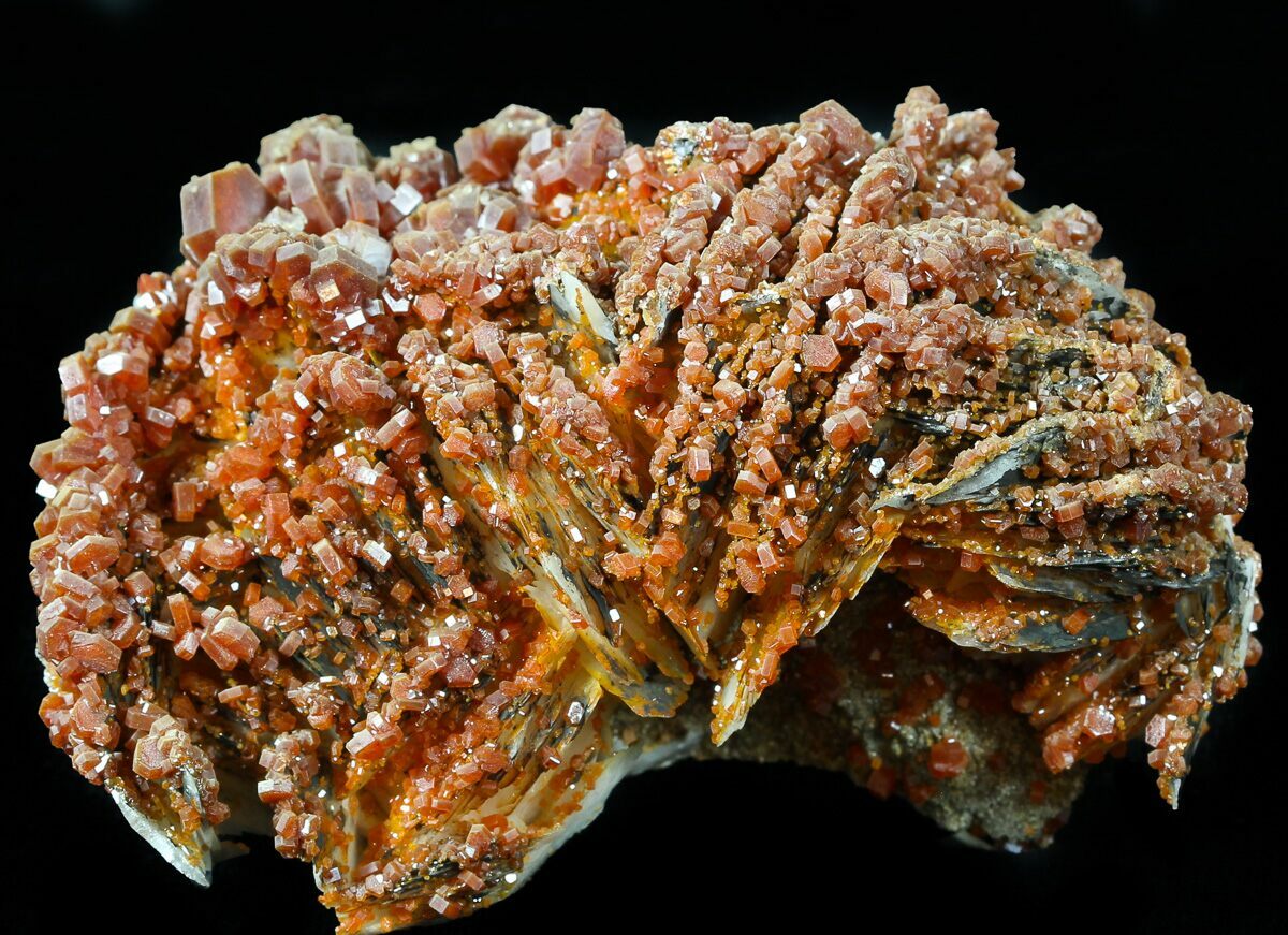 Vanadinite from Morocco is world-famous for producing some of the finest red crystal specimens on the planet. In the arid hills surrounding Mibladen and Taouz, vanadinite forms as vibrant clusters of hexagonal prisms, often with a deep crimson to orange-red color that seems to glow against the pale desert matrix. These crystals typically develop in dense groups, coating barite blades or covering weathered limestone with dazzling, glassy faces and sharp geometric symmetry. The dryness of the region and the slow oxidation of ancient lead deposits create the perfect geochemical environment for vanadinite to grow with exceptional clarity, luster, and intensity of color. Moroccan vanadinite is highly prized by collectors for its bold aesthetics, architectural crystal formations, and the consistent quality that has made these localities the global benchmark for the species.