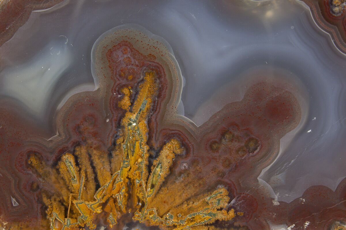 This is an attractive, 3" wide, polished Laguna agate nodule section. It has been cut flat on one side and polished to a glossy finish, revealing the blue-purple, red, and orange banding patterns.