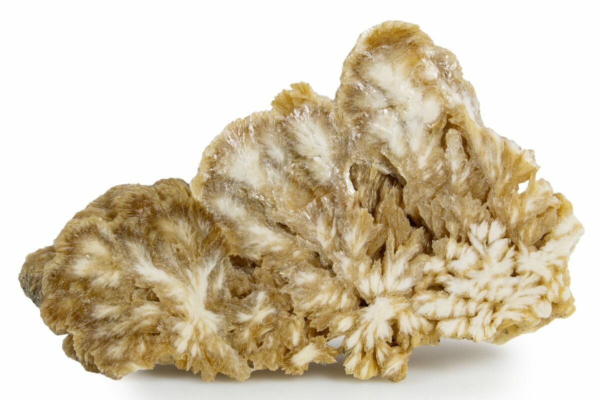 This is a 3 x 1.75" cut and polished section of barite with glittering pyrite from the Lubin Copper Mine in Poland. The barite has formed in a unique branching structure and is fluorescent under UV light. The backside of this specimen displays the natural barite crystals.