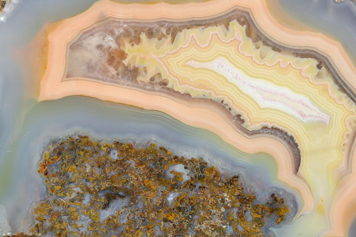 This is a beautiful, 3" wide, polished slice of a Moctezuma agate nodule, collected from Chihuahua, Mexico. It features alternating bands of pastel yellow-orange and salmon colored agate, and has been cut flat and polished to a glossy finish.