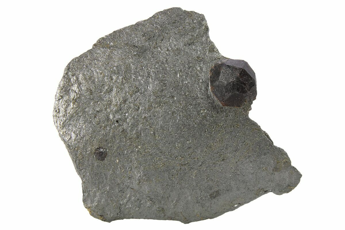 This is a 0.3" wide almandine garnet that's in a graphite matrix from the Red Embers Mine near Erving, Massachusetts. The graphite matrix has been worked to expose most of the garnet from each side. Small dravite crystals can be found scattered across both sides of the matrix.