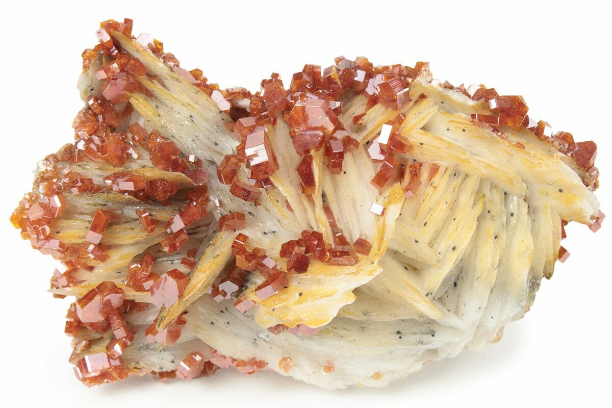 This is a cluster of lustrous, ruby-red vanadinite crystals on a bed of white to light-orange, bladed barite from the Mibladen Mining District in Morocco. The crystals have great color, are extremely lustrous, and are free of damage.