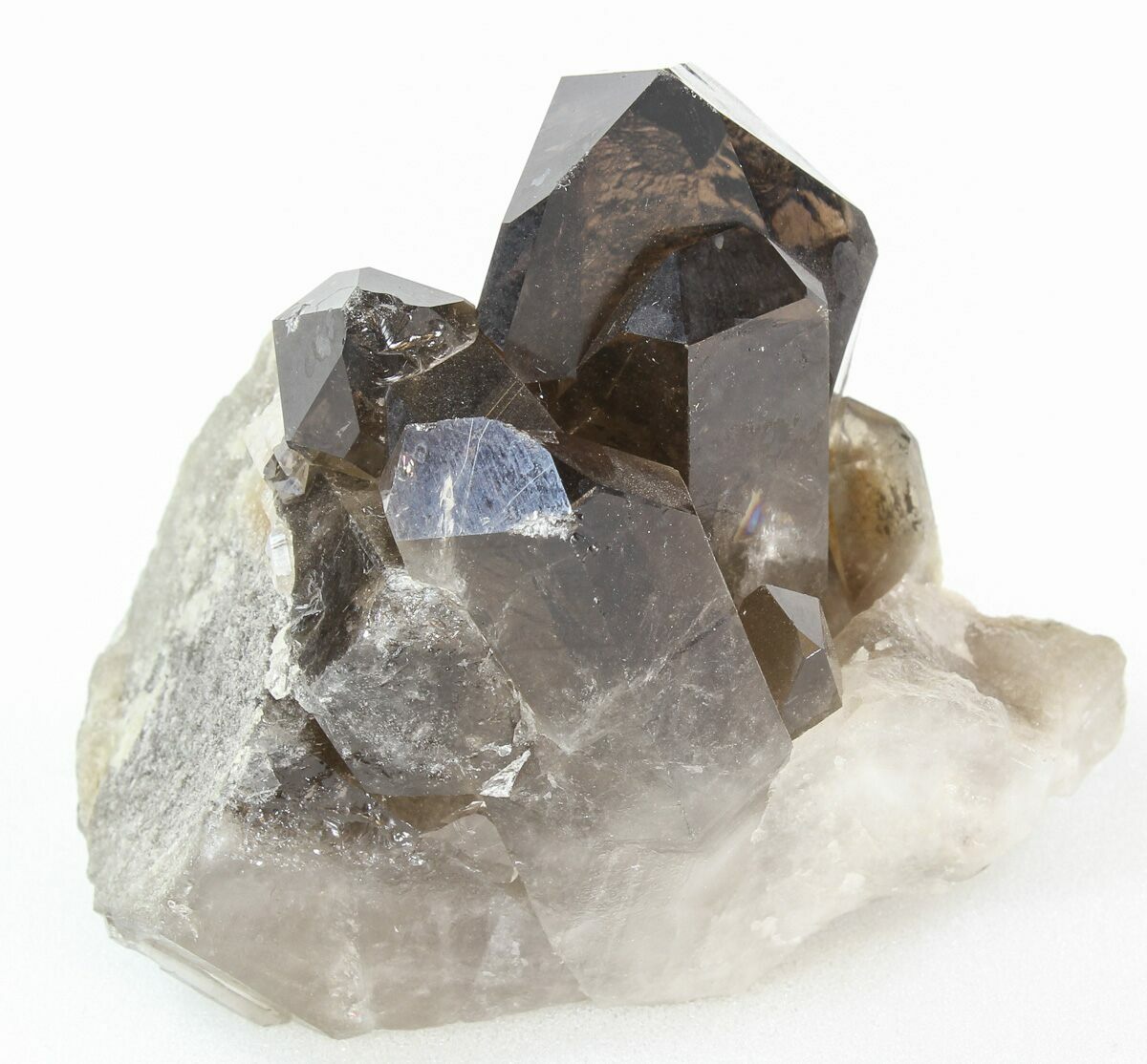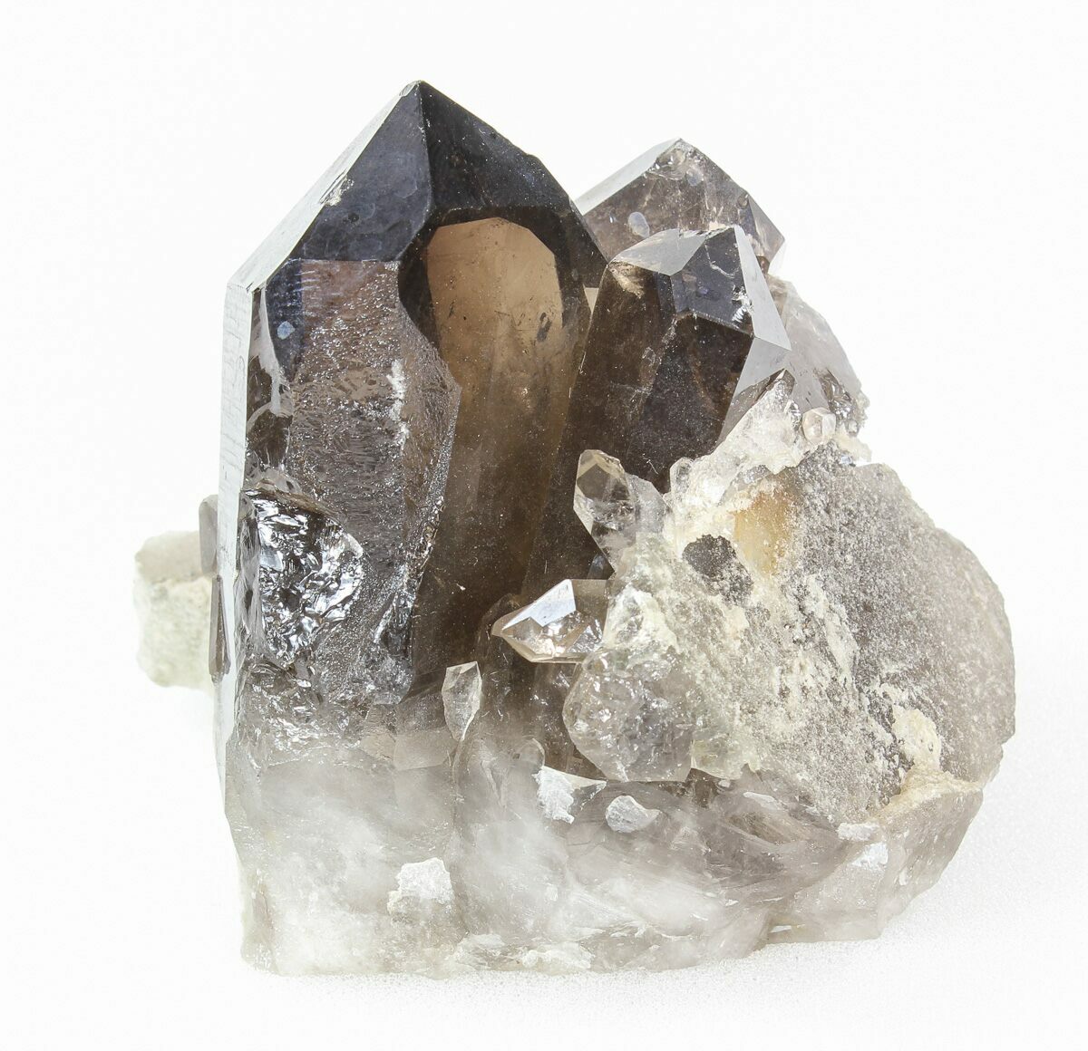 This is a 3" long, natural cluster of dark smoky quartz crystals from Brazil. Nice terminations with only some minor dings. The crystals are more cloudy at the base, getting darker near the tips. The color is natural and the crystals have not been heated or treated. Very good quality crystals.