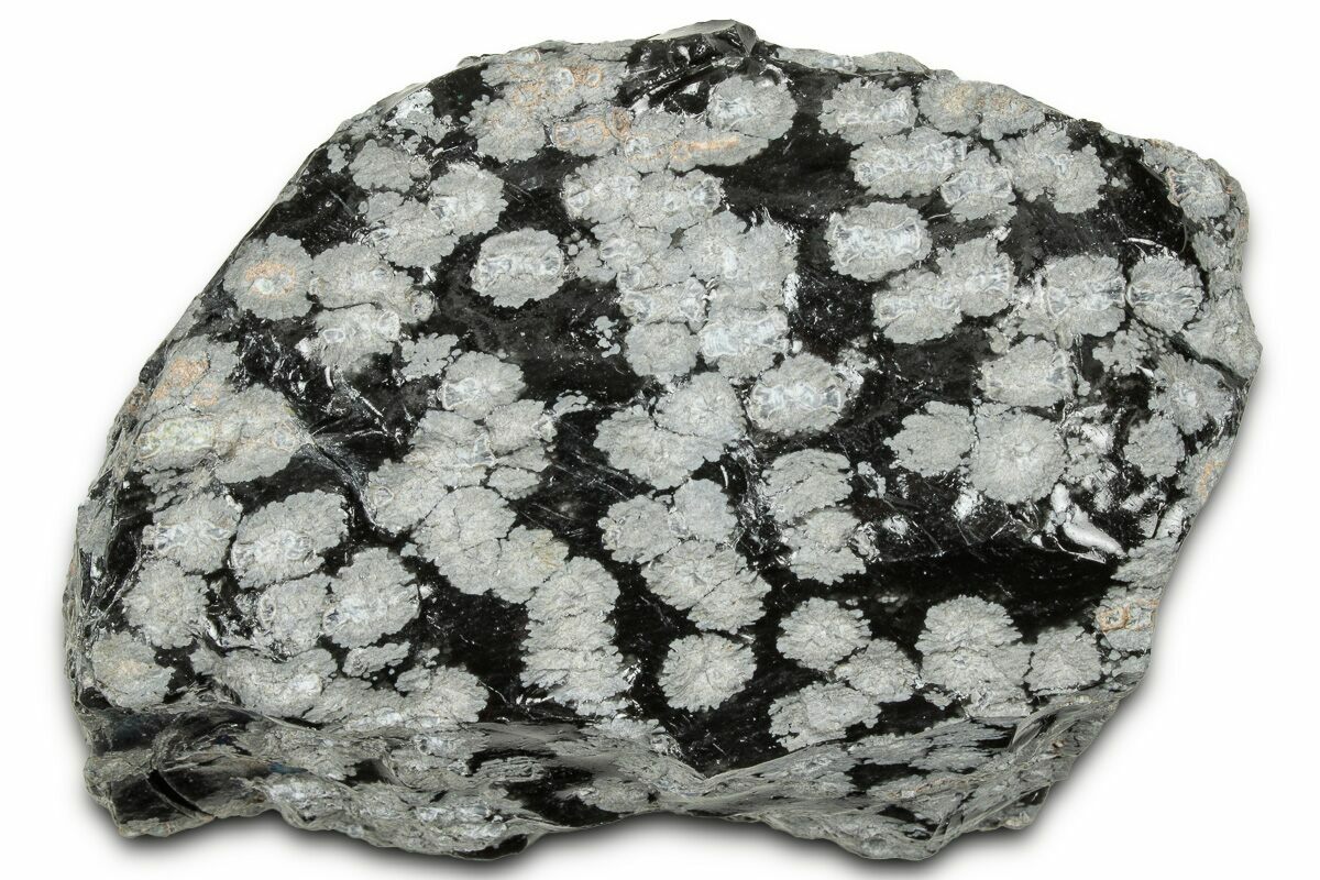 Snowflake obsidian is found near Sevier Lake in Millard County, Utah. It is a natural volcanic "glass" that forms when molten rock cools so quickly that that atoms do not have enough time to arrange themselves into crystals. Instead, the molten material solidifies into an amorphous solid called a glass. The "snowflakes" in the obsidian are small, white, radially clustered crystals of cristobalite, a mineral polymorph of silica.
