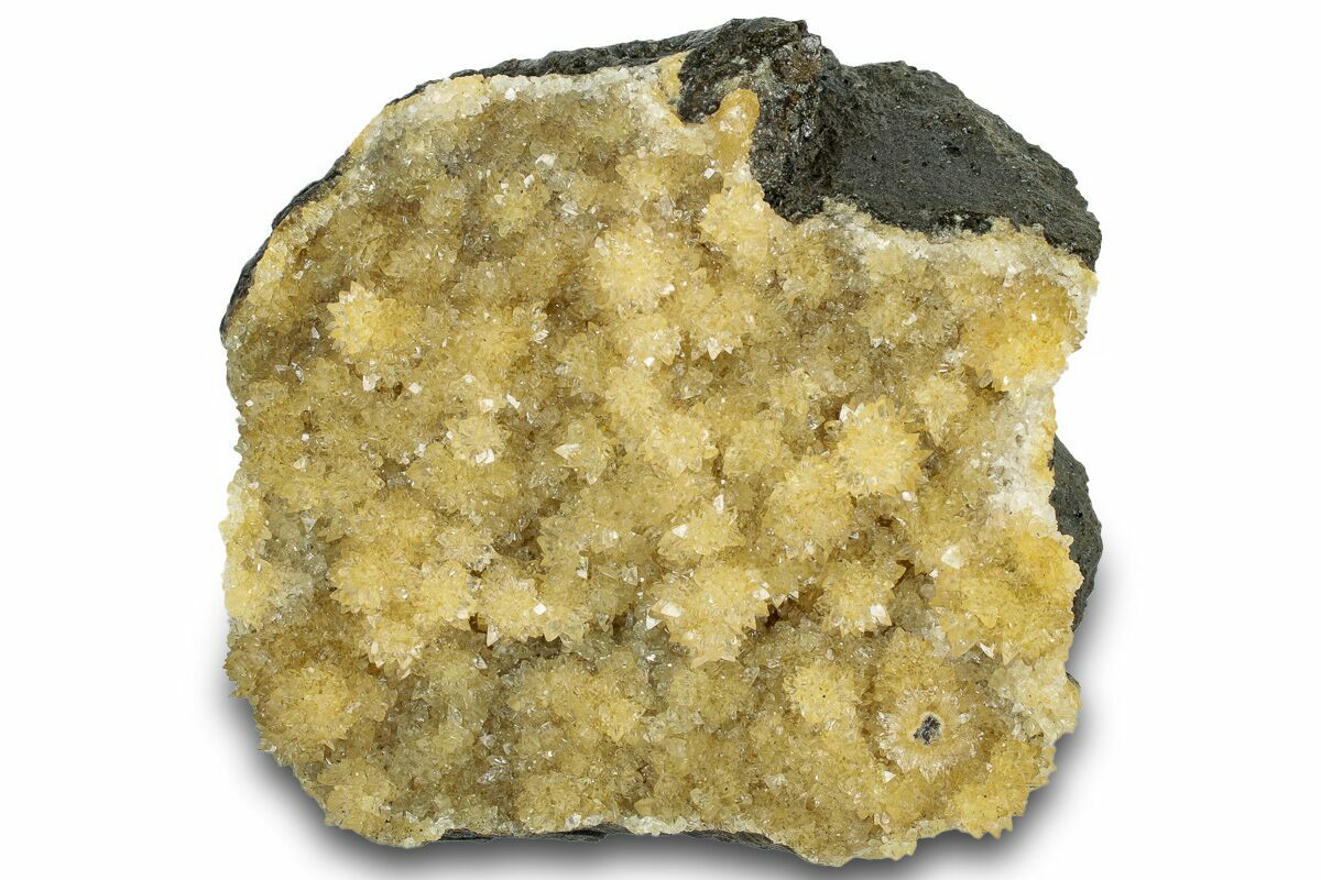 This is a 3" wide, cluster of sharp orange calcite crystals on basalt. This comes from the Grabiszyce Basalt Quarry in the Luban District of Poland. Under shortwave UV, these crystals fluoresce a white-orange color.