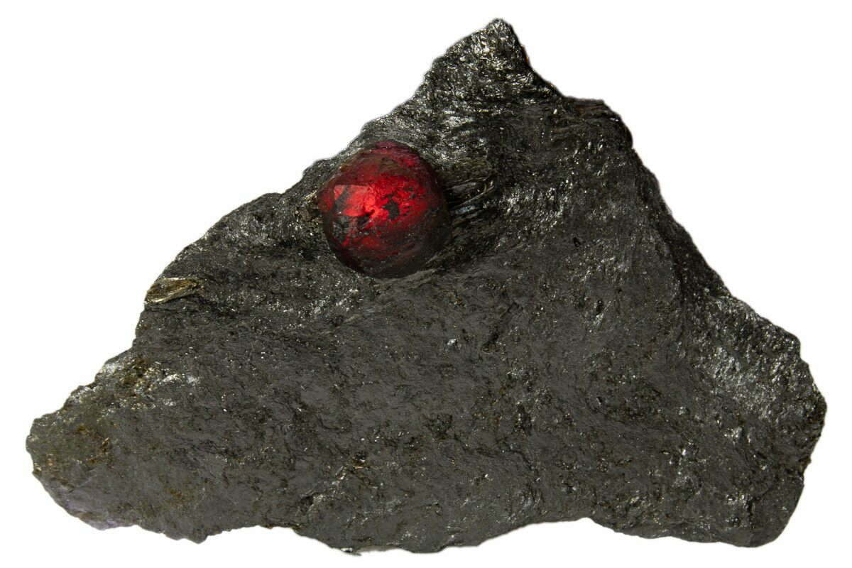 This is a .33" wide almandine garnet in a graphite matrix from the Red Embers Mine near Erving, Massachusetts. The graphite matrix has been worked to expose most of the garnet from each side. There are dravite crystals peppered throughout the graphite matrix.
