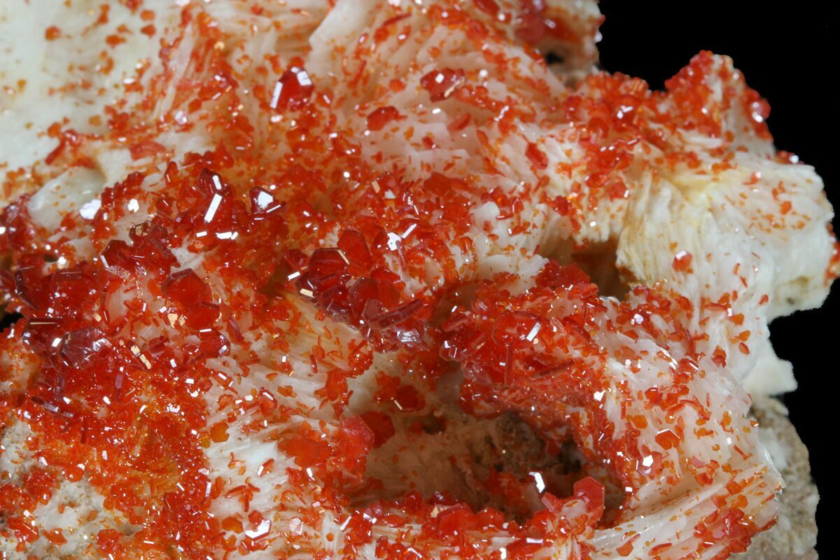 Vanadinite from Morocco is world-famous for producing some of the finest red crystal specimens on the planet. In the arid hills surrounding Mibladen and Taouz, vanadinite forms as vibrant clusters of hexagonal prisms, often with a deep crimson to orange-red color that seems to glow against the pale desert matrix. These crystals typically develop in dense groups, coating barite blades or covering weathered limestone with dazzling, glassy faces and sharp geometric symmetry. The dryness of the region and the slow oxidation of ancient lead deposits create the perfect geochemical environment for vanadinite to grow with exceptional clarity, luster, and intensity of color. Moroccan vanadinite is highly prized by collectors for its bold aesthetics, architectural crystal formations, and the consistent quality that has made these localities the global benchmark for the species.