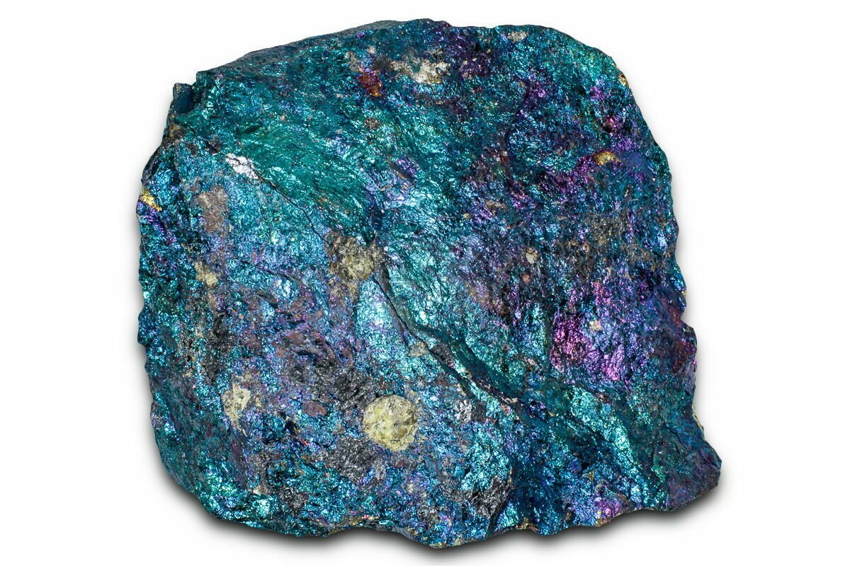 Commonly referred to as Peacock Ore due to its brilliant iridescent coloration, this mineral is actually acid treated chalcopyrite. This acid treatment mimics a natural process that creates the much rarer copper-based mineral Bornite.