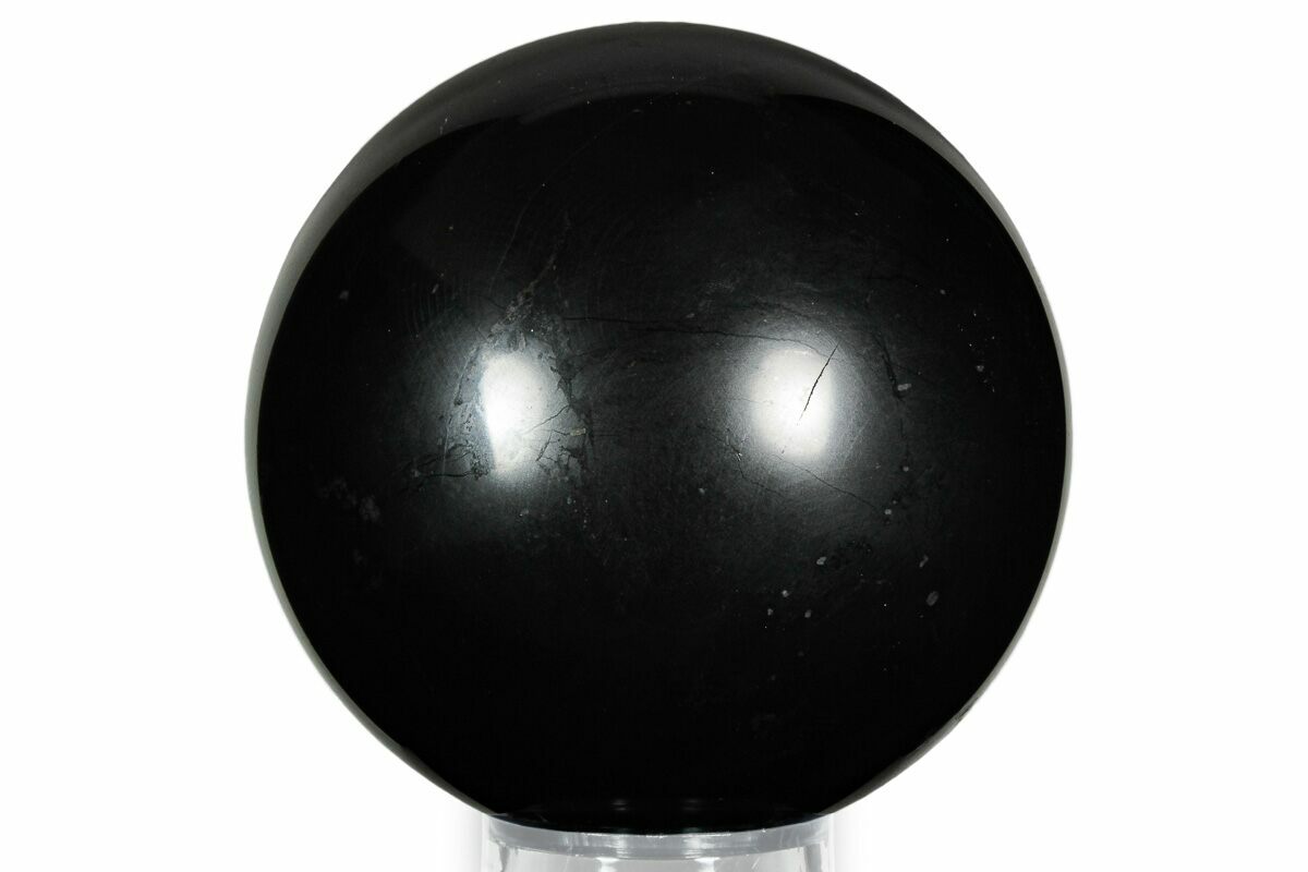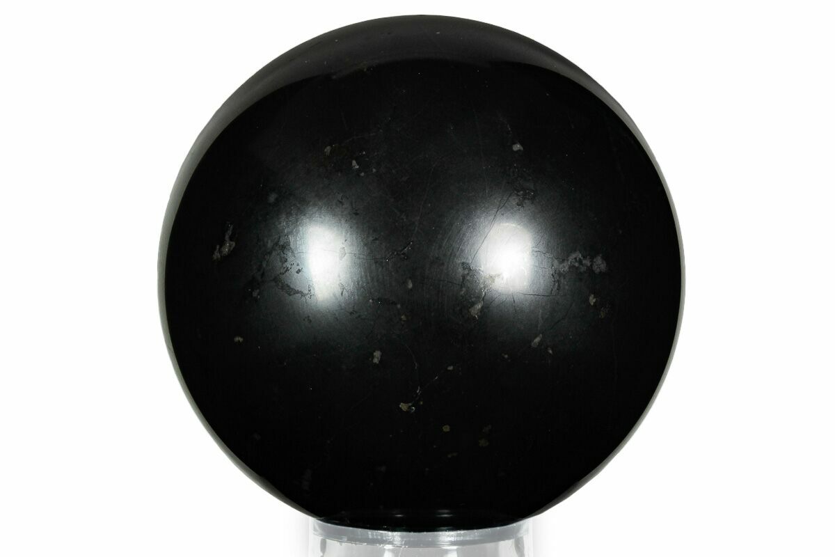 This is a shiny, 4" wide polished sphere of shungite. It comes with an acrylic ring stand.
