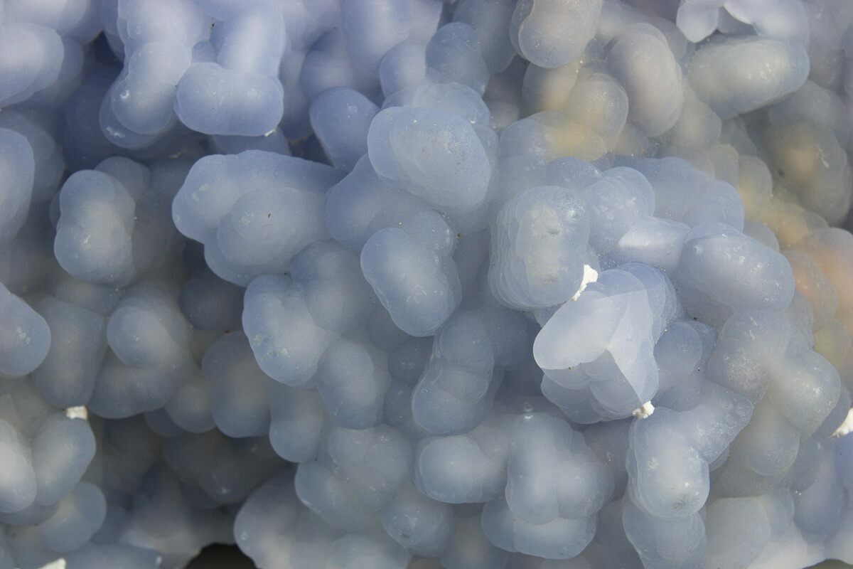 This is a fascinating formation of botryoidal blue chalcedony pseudomorphed after anhydrite crystals, collected from Rumipata, Peru. Remnants of the anhydrite crystals can be seen around the periphery of the specimen.