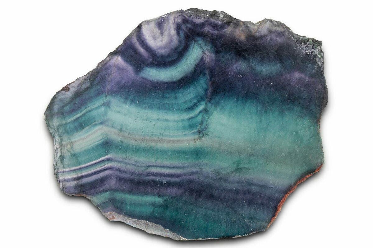 This is a beautiful slab of polished fluorite mined in China. Both sides have been polished to a mirror finish, allowing for presentation of the gorgeous, colorful layers of crystal formation. The specimen has been backlit in the photos to better show the colors.