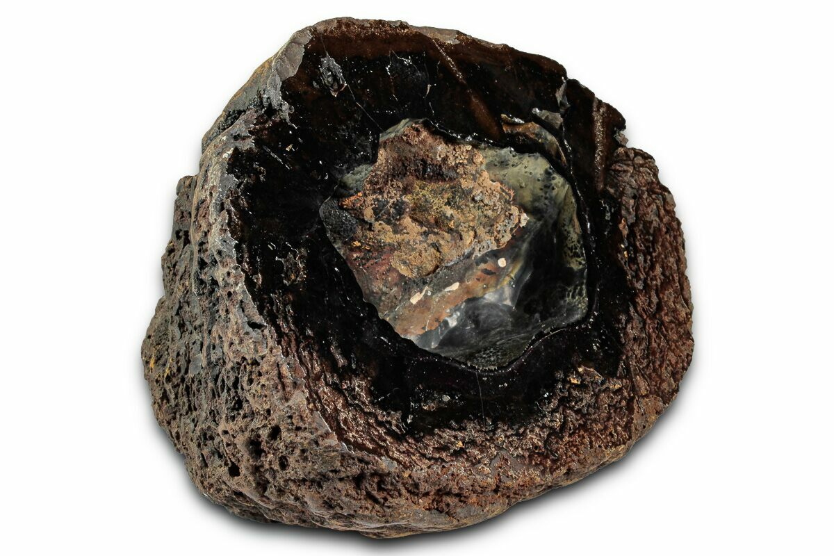 These geodes are grey to black on the outside, often with a rusty red streak. Inside, they can feature sparkling crystals (specularite) or smooth, metallic, botryoidal formations. They form in iron-rich, oxidized environments, often associated with banded iron formations.
