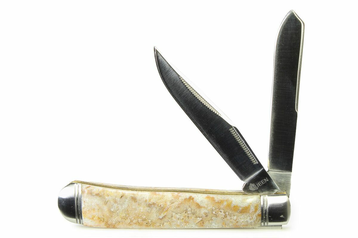 This exquisite 4.1" pocket knife is a true celebration of natural artistry and skilled craftsmanship. Handcrafted in Utah, it features breathtaking inlays of Mexican lace agate, renowned for its intricate banding and rich swirls of orange, cream, and gold. Each inlay is carefully selected and polished to highlight the stone’s mesmerizing patterns, making every knife a one-of-a-kind work of natural art.