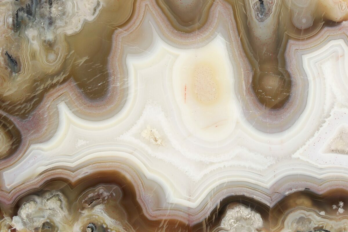 Agate is a variety of microcrystalline quartz (chalcedony) that displays translucence and, in some cases, banding. Agate primarily forms when silica-rich fluids fill pockets within rocks and/or fossils, depositing the silica along the walls of the rock. This process can result in banding patterns, as the compositions and impurities of these depositing fluids change over time. These banding patterns can either form as flat layers, creating linear patterns known as waterline agate, or as rounded layers, forming more common ring-like patterns. These patterns depend on the surfaces available for deposition.