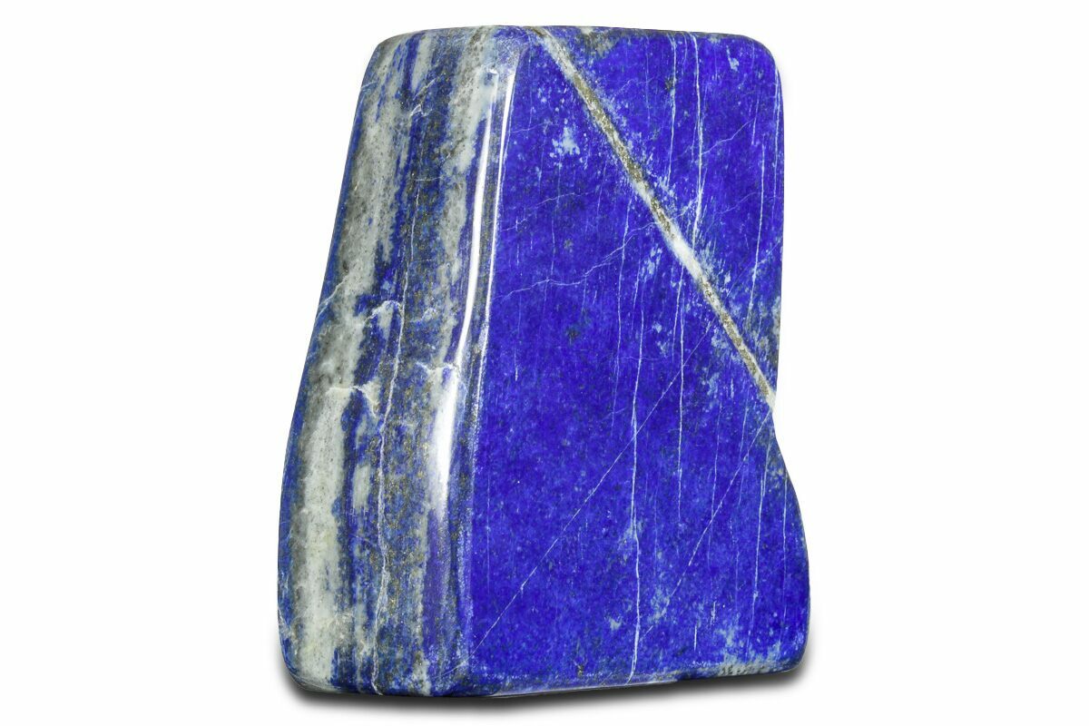 This is a 4.1" wide, polished piece of lapis lazuli with streaks of sparkling pyrite running through it. This vibrant blue stone was mined from northern Pakistan.