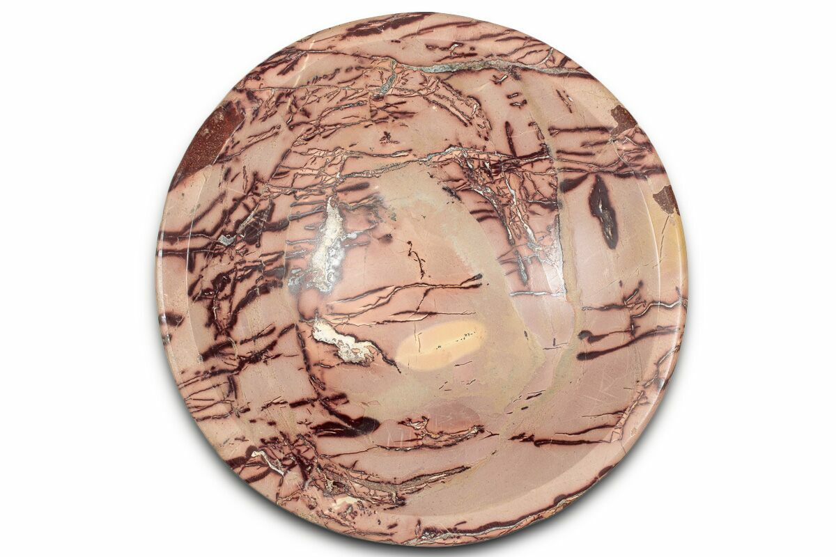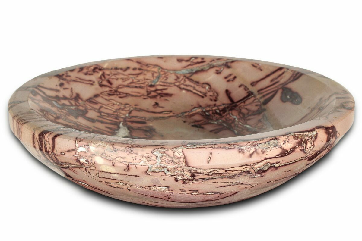 This is a beautiful, 4.1" wide decorative dish crafted from "Saharan desert jasper", also known as "Moroccan mookaite", collected in Morocco. The jasper bears a mixture of sienna hues and has been lightly polished to highlight the patterns and colors.