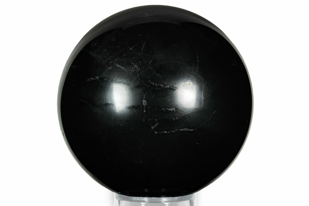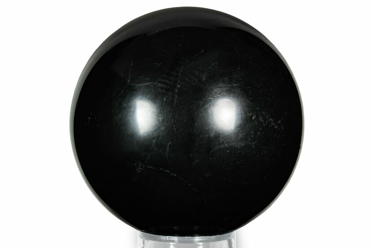 This is a shiny, 4.1" wide polished sphere of shungite. It comes with an acrylic ring stand.