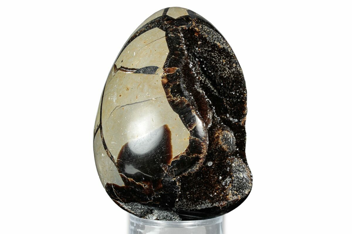This is a gorgeous septarian "dragon egg" geode collected in the Betsiboka Region of Madagascar. The hollow cavity is full of beautiful, sparkling black & brown calcite crystals. It is a hollow septarian nodule which has been polished into an egg shape, and the natural cracked pattern of the septarian gives it the appearance of a dragons egg. A spectacular display piece which would look great in your home/office or make a great gift for the Game of Thrones enthusiast you know.