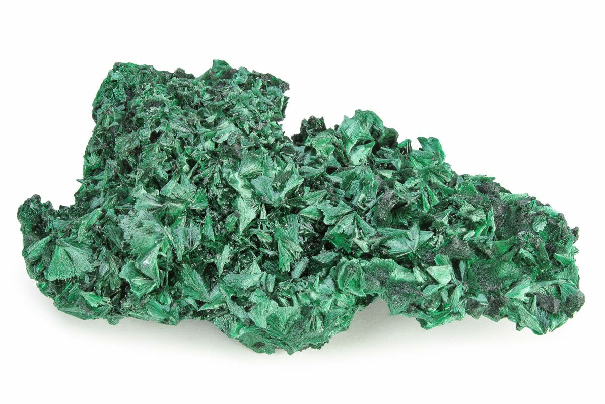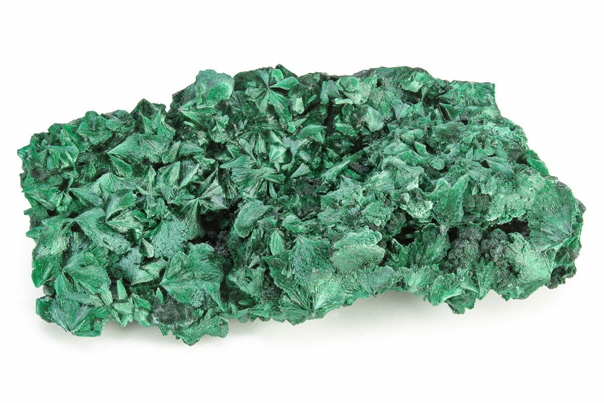 Malachite is an intense green copper-based mineral that can be found in a wide variety of forms. Malachite can grow in botryoidal masses, stalactitic formations, and reniform formations, typically as a tight cluster of fanning fibrous needles that make up a seemingly solid mass. As layers continue to stack during formation, banded patterns can sometimes begin to take shape, explaining the rings in all shades of green seen on most polished malachite specimens.