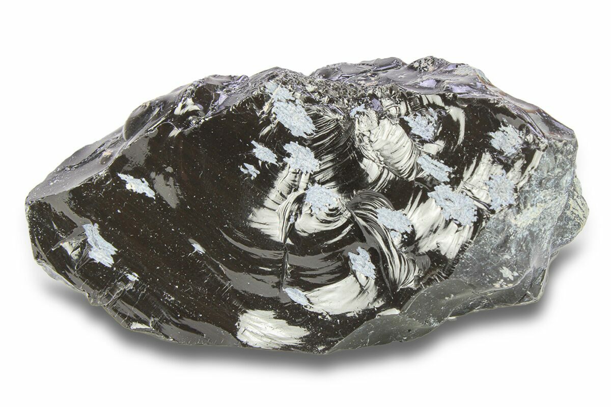Snowflake obsidian is found near Sevier Lake in Millard County, Utah. It is a natural volcanic "glass" that forms when molten rock cools so quickly that that atoms do not have enough time to arrange themselves into crystals. Instead, the molten material solidifies into an amorphous solid called a glass. The "snowflakes" in the obsidian are small, white, radially clustered crystals of cristobalite, a mineral polymorph of silica.