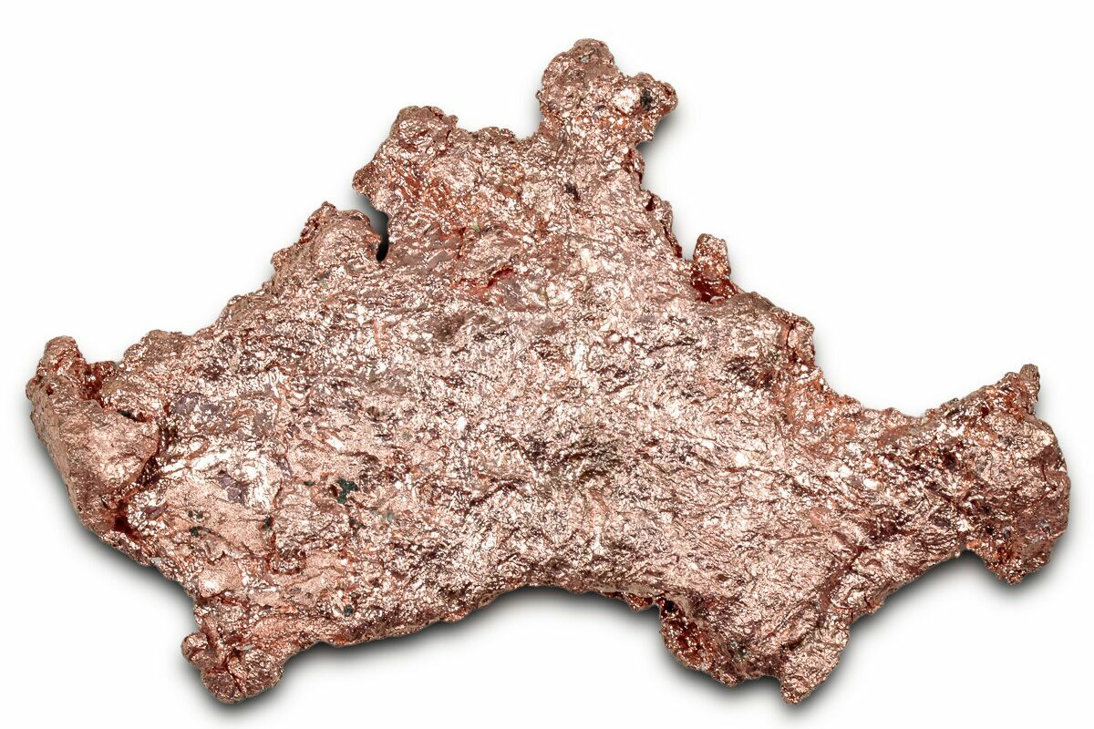 Native copper occurs rarely as isometric cubic and octahedral crystals, but more typically as irregular masses and fracture fillings. It has a reddish, orangish, and/or brownish color on fresh surfaces, but typically is weathered and coated with a green tarnish of copper carbonate.