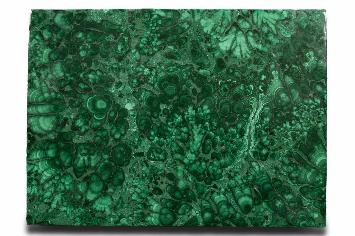 Malachite is an intense green copper-based mineral that can be found in a wide variety of forms. Malachite can grow in botryoidal masses, stalactitic formations, and reniform formations, typically as a tight cluster of fanning fibrous needles that make up a seemingly solid mass. As layers continue to stack during formation, banded patterns can sometimes begin to take shape, explaining the rings in all shades of green seen on most polished malachite specimens.