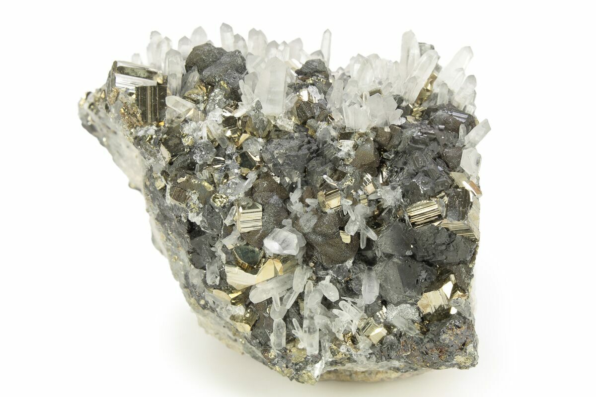 4.2" Brassy Chalcopyrite, Pyrite, and Sphalerite on Quartz - Peru