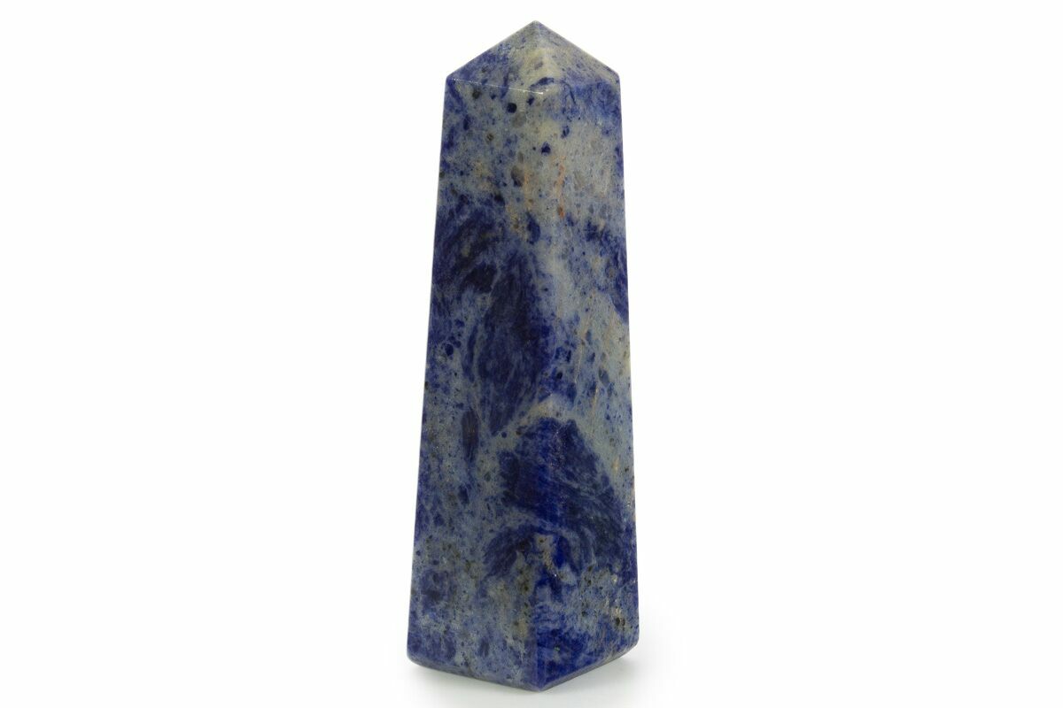 This is a 4.2" tall, polished sodalite tower from Namibia. It displays the classic deep-blue coloration that sodalite is known for, streaked with contrasting veins of white and subtle hints of gray. The polish brings out its natural luster, making the swirling patterns especially vivid under light.
