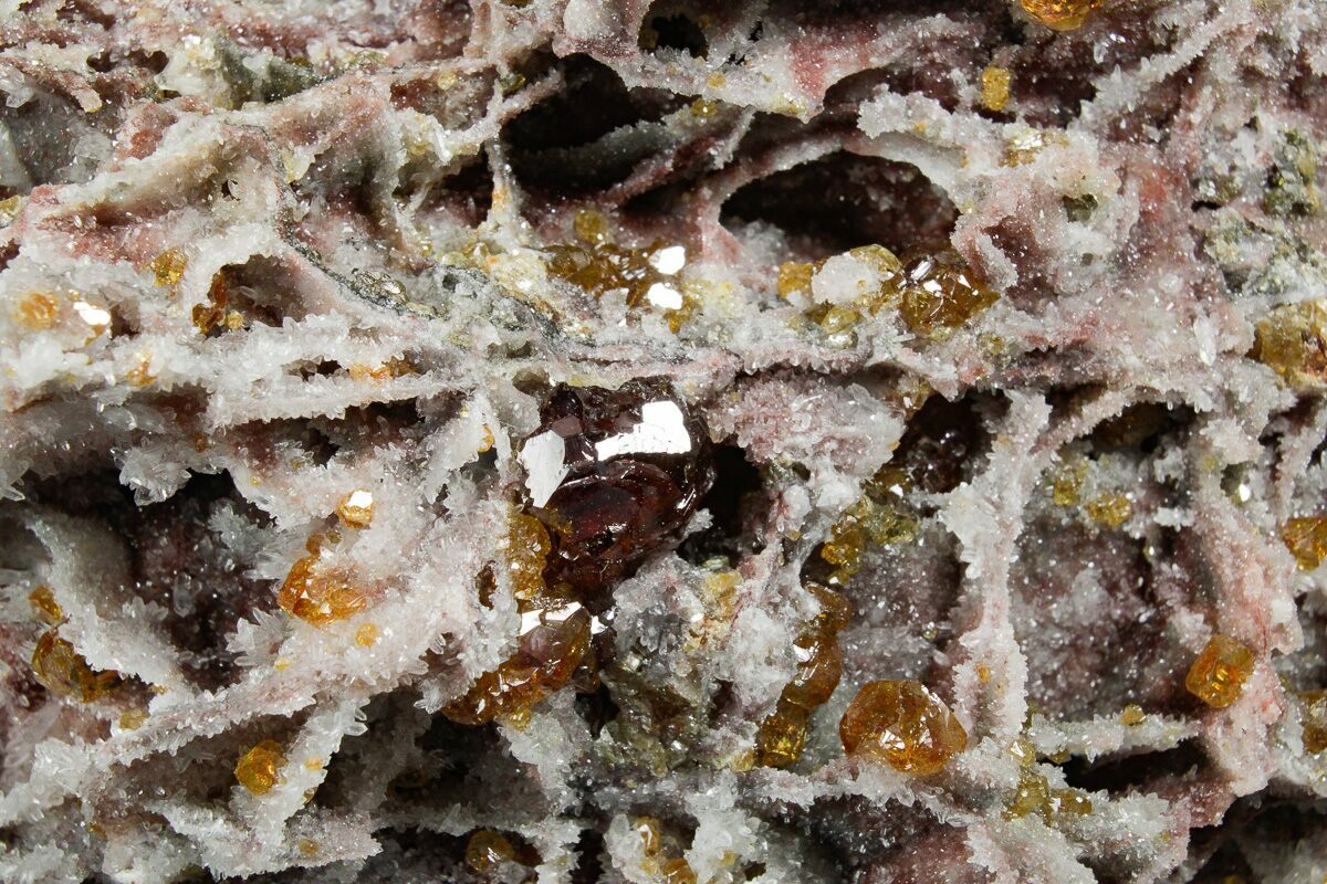 Here is a beautiful, 4.2" wide specimen featuring translucent orange sphalerite crystals scattered across a spiderweb of druzy quartz encrusted matrix. This specimen was collected from the Shuikoushan ore field of China.
