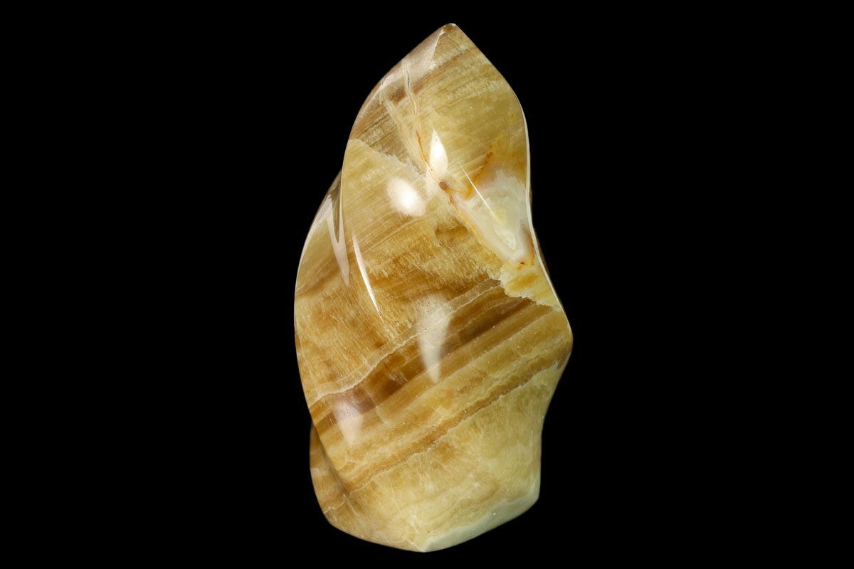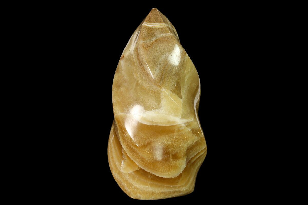 This is brown calcite from Madagascar which has been hand-polished into a "flame" shaped sculpture. This unique specimen is 4.2" tall and has multiple layers of calcite that vary between tan, white, brown and orange hues. The base has been cut to allow for aesthetic presentation.