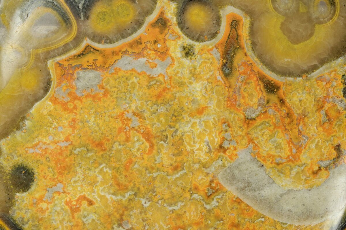 Bumblebee jasper is the trade name for a vibrantly colored, fibrous calcite mined exclusively from Mount Papandayan in Indonesia. It is has very distinctive yellow, orange, and black banding resembling the color patterns of a bumblebee, hence the name. The orange and yellow colors are mainly caused by finely dispersed realgar while the black bands are caused by pyrite. Technically it is not a jasper, as it is primarily calcite and contains very little silica.